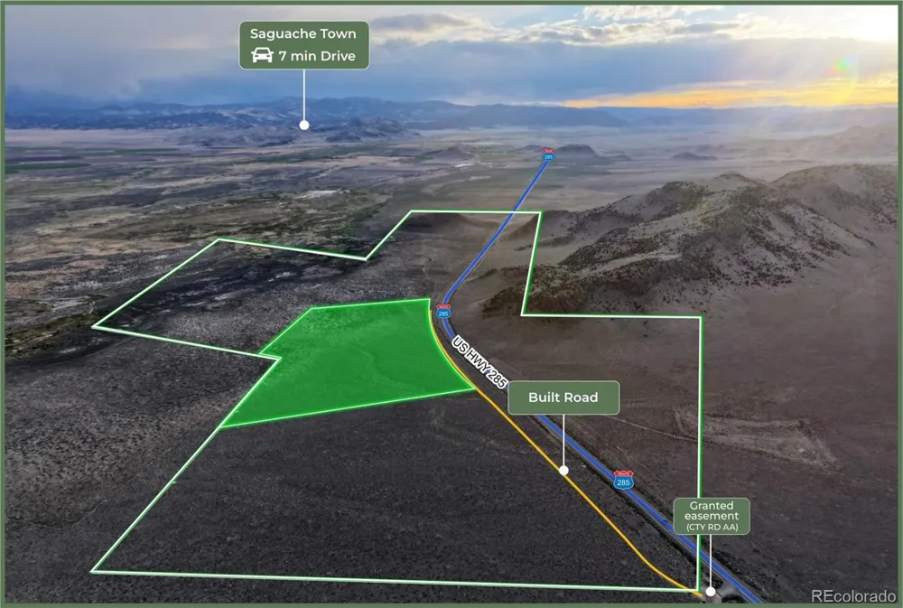 35+ acres of open, buildable Colorado land with wide panoramic mountain views and direct access off Highway 285—just 4 minutes from Saguache. This parcel offers a rare combination of usable terrain, year-round access, and immediate PROXIMITY and AVAILABILITY to 59,687 acres of BLM land that link to over 500,000 acres of National Forest. IDEAL for building sites, agricultural use, off-grid projects, or long-term investment. A built access road connects directly to Hwy 285, and an additional granted easement via County Road AA provides secondary legal access. Survey is completed, the DRIVEWAY access permit is approved, ELECTRICITY is available at the lot line, and the WATER PERMIT includes 1 acre of irrigation—a rare and valuable resource in this region. With NO HOA, no covenants, and no building codes, the land allows full flexibility for homes, cabins, ADUs, shops, or recreational structures (per county guidelines). Located in GMU 681, the area is known for ELK movement, BIG-GAME activity, and peaceful, wide-open landscapes. Property Features: • 35+ acres with open, usable, buildable terrain • Panoramic mountain and valley views • Near access to 59,687 acres of BLM + National Forest connection • Built road from Hwy 285 for easy year-round access • Additional legal easement via County Road AA • Survey completed • Driveway access permit approved • Water permit with 1 acre of irrigation • Electricity at lot line • NO HOA / NO covenants / NO building codes • Multiple dwellings + ADUs allowed • Located in GMU 681 (elk corridor + strong wildlife presence) • Maps, 3D boundaries, and aerial imagery available Nearby Destinations: • Great Sand Dunes – 50 min • Arkansas River rafting – 30 min • Monarch Mountain – 1 hr • Numerous trails, hot springs, and public-land recreation areas Comparable Hwy 285 parcels in this corridor routinely trade for $300K–$500K, making this a high-value land hold with strong long-term potential.