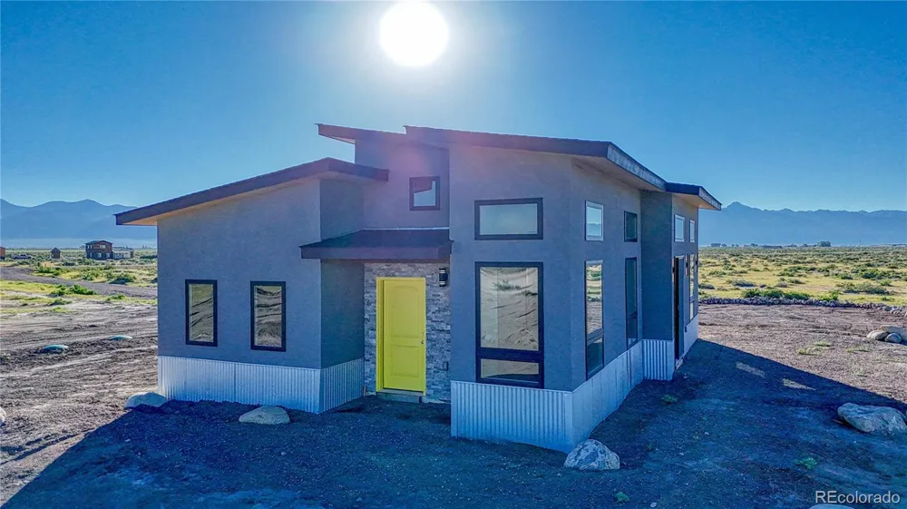 SLV Retreat. Energy Efficient Contemporary Bungalow with Solar Power and Sweeping Views. Modern electric-powered bungalow perched on 36 acres in the San Luis Valley is all new construction: 2 bedroom/1 bath home features an open concept living space with polished concrete floors, high, vaulted ceilings and passive-solar-inspired south facing windows. Designed to harvest sunlight, this home is entirely electric, well-insulated, features cove heating and a 4 kw solar system that is tied to the grid. Eat-in kitchen with wrap-around bar, stainless steel appliances, stacked stone accents and quartz counter tops. Pocket doors on bed and bath rooms maximize space and create a warm minimalist feel. Spacious 5-piece bath with a modern-spa vibe includes tiled shower and free-standing bathtub. Domestic well permit allows for the construction of up to 3 dwelling units (total) and oversize septic system is engineered for 4 bedrooms with a 1500 gallon tank. A unique offering with room to roam. 15 mies from the quaint canopied town of Saguache, 45 miles to Salida, an hour to Monarch Ski Area and 1.5 hours to Wolf Creek Ski area, nearby hot springs and plenty of area wilderness to explore. Plans (permit set) are attached to this listing and available through the listing agent.
