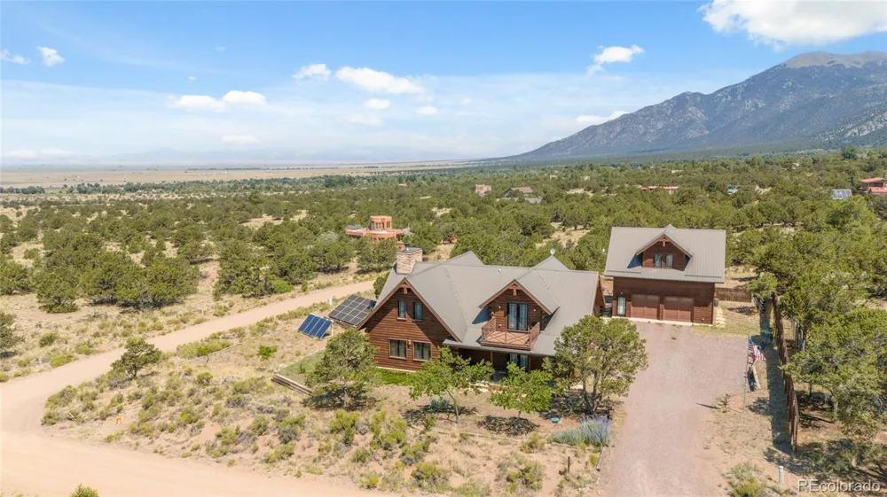 Once in a generation opportunity to own this luxury American Bungalow, nestled in the Baca Grande Chalet One neighborhood. Situated across from the expansive Center for Contemplative Research 160 acre property, the home was built by Aspen builder John McKean with steel beam construction. Situated on an acre of land, with over 3700 sq ft of living space between the house and the apartment above the garage. The soaring cathedral ceilings were specifically engineered by a local engineer to achieve the exceptional design. Large windows in all directions provide profuse light throughout the day, and radiant floor heat is supplemented by the large wood burning stove to heat the house on cold winter nights. The great room opens up to the chef's kitchen, with ample cabinets and Viking brand stainless steel appliances. The downstairs bedroom is replete with windows, a huge walk in closet, and include french doors opening up to a spacious veranda looking out to the mountains. This bedroom also includes a private full bathroom with separate tub and shower spaces, clad in travertine tile with marble accents. Next door, the office room's configuration is perfect for a large desk, sitting or meditation room, or extra bedroom with a full bath attached. Upstairs, the stunning vaulted bedroom includes rich machined hardwood floors, custom built in cabinet storage and another beautiful travertine/marble tile bathroom, with a private balcony to enjoy the expansive views. The two car garage includes a miniature version of the same home architecture on the second floor, with exposed beams in the complete apartment. One of the first homes in the area to take advantage of a grid-tied photovoltaic (solar) system, the monthly electric bill for the home hovers around $100, and the in floor radiant heat system is also supplemented by solar water panels. A back up generator also provides extra insurance against outages. Experience this luxury Crestone home to see all of the stunning details.